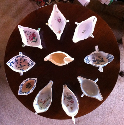 They are a varied group, but all 18th century porcelain & pottery. As a group they trace the evolution of the form, and illustrate the change in style over the course of the century.
