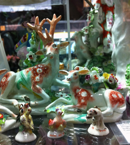 Animals feature in this scene, with seals- a pair of kissing doves and a hen & chicks from Chelsea, and a comical dog from St James. In the background is a herd of Derby Deer.